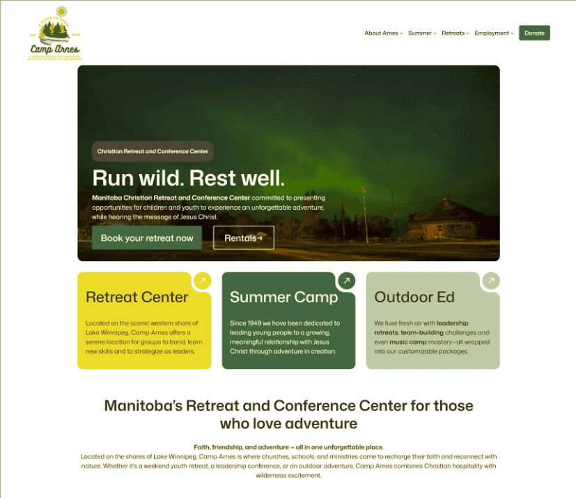 Camp Arnes isn’t just a summer camp; it’s a year-round engine of outdoor ed, corporate retreats, and community events. Since 1949, Camp Arnes been a Manitoba staple, but their digital presence was starting to show its age. It was time for a fresh website design.